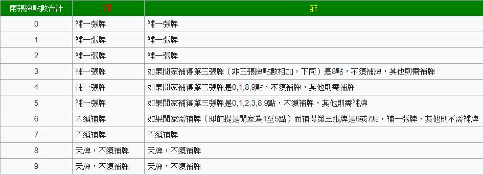 至於什麼時候補牌,打百家樂的朋友一定要弄懂,簡單的劃分小編教會各位,首先莊家和閒家兩張牌加總的點數為6點(含)以上的時候不需要補牌,直接比大小。但比較特殊的情況還是有的,例如兩邊點數相加是3點的時候,雙方都需要補牌,順序為閒家先後來才是莊家補牌,如果此時閒家補到8點,總和是1點的時候,莊家不須補牌直接贏;兩邊點數相加是4點,閒家若補到0、1、8、9的時候,莊家一樣不須補牌直接贏;兩邊點數相加是5點,閒家補牌的點數若為0、1、2、3、8、9,莊家也不用在補牌直接贏。